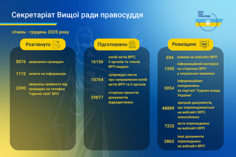 Співробітниками секретаріату Вищої ради правосуддя протягом 2025 року опрацьовано 5876 звернень громадян та 1172 запити на інформацію.