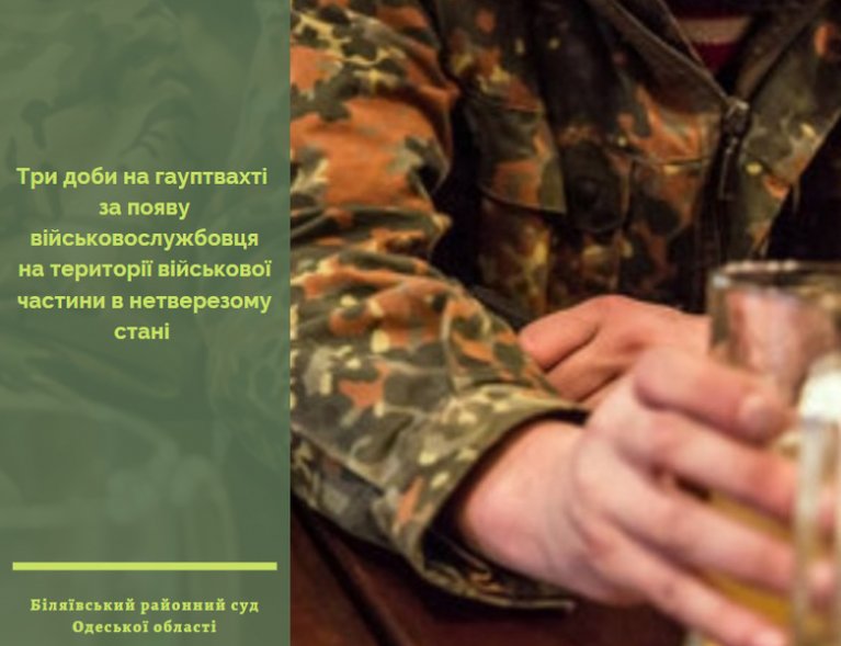 16 грудня 2019 року суддя Біляївського районного суду Одеської області, розглянувши матеріали, які надійшли від командира бригадної військової частини А0216, визнала громадянина С. винним у скоєнні адміністративного правопорушення, передбаченого частиною першою статті 172-20 Кодексу України про адміністративні правопорушення та піддала його адміністративному стягненню у вигляді арешту з утриманням на гауптвахті на строк – 3 доби.