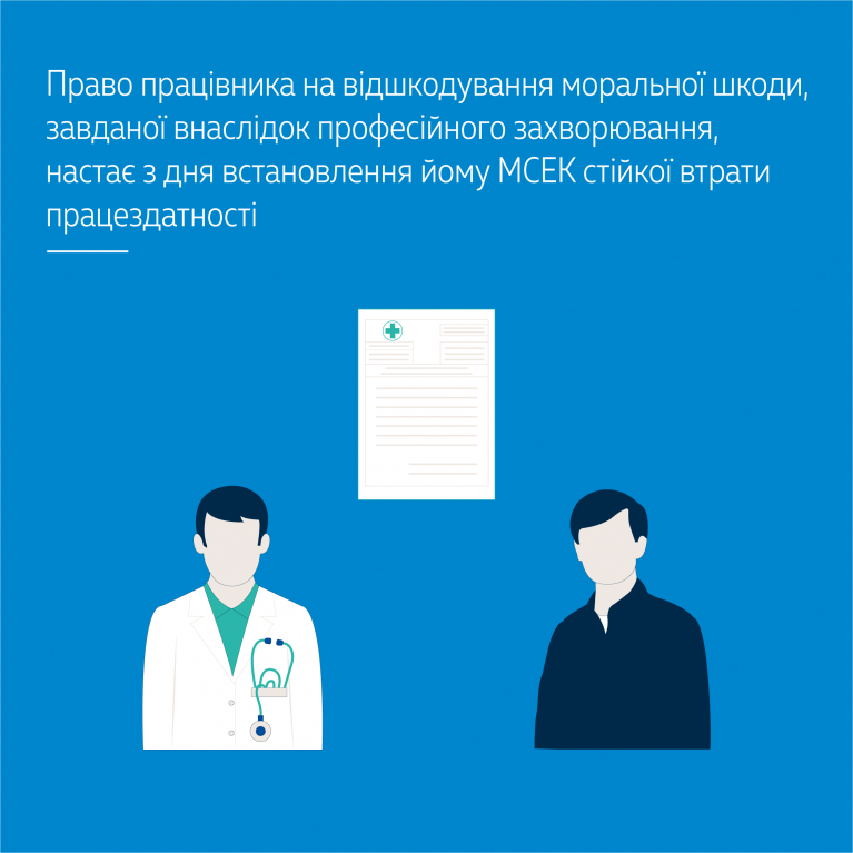 Однак внаслідок внесення змін до законодавства це право було скасоване. Разом з тим у Рішенні від 8 жовтня 2008 року № 20-рп/2008 Конституційний Суд України вказав на те, що право громадян, які є потерпілими від нещасного випадку на виробництві або професійного захворювання, на відшкодування моральної шкоди не порушено, оскільки ст. 1167 ЦК України та ст. 237-1 КЗпП України їм надано право відшкодовувати моральну шкоду за рахунок роботодавця. Велика Палата ВС зауважила, що у згаданому Рішенні Конституційний Суд України не встановлював ретроспективну дію законодавства і обов’язок роботодавця відшкодувати моральну шкоду, отже, відповідні спори повинні вирішуватися на підставі норм права (Закон №1105-XIV) які були чинними на момент виникнення в потерпілого права на її відшкодування. Право на відшкодування моральної шкоди внаслідок професійного захворювання настає з дня первинного встановлення МСЕК потерпілому стійкої втрати працездатності.