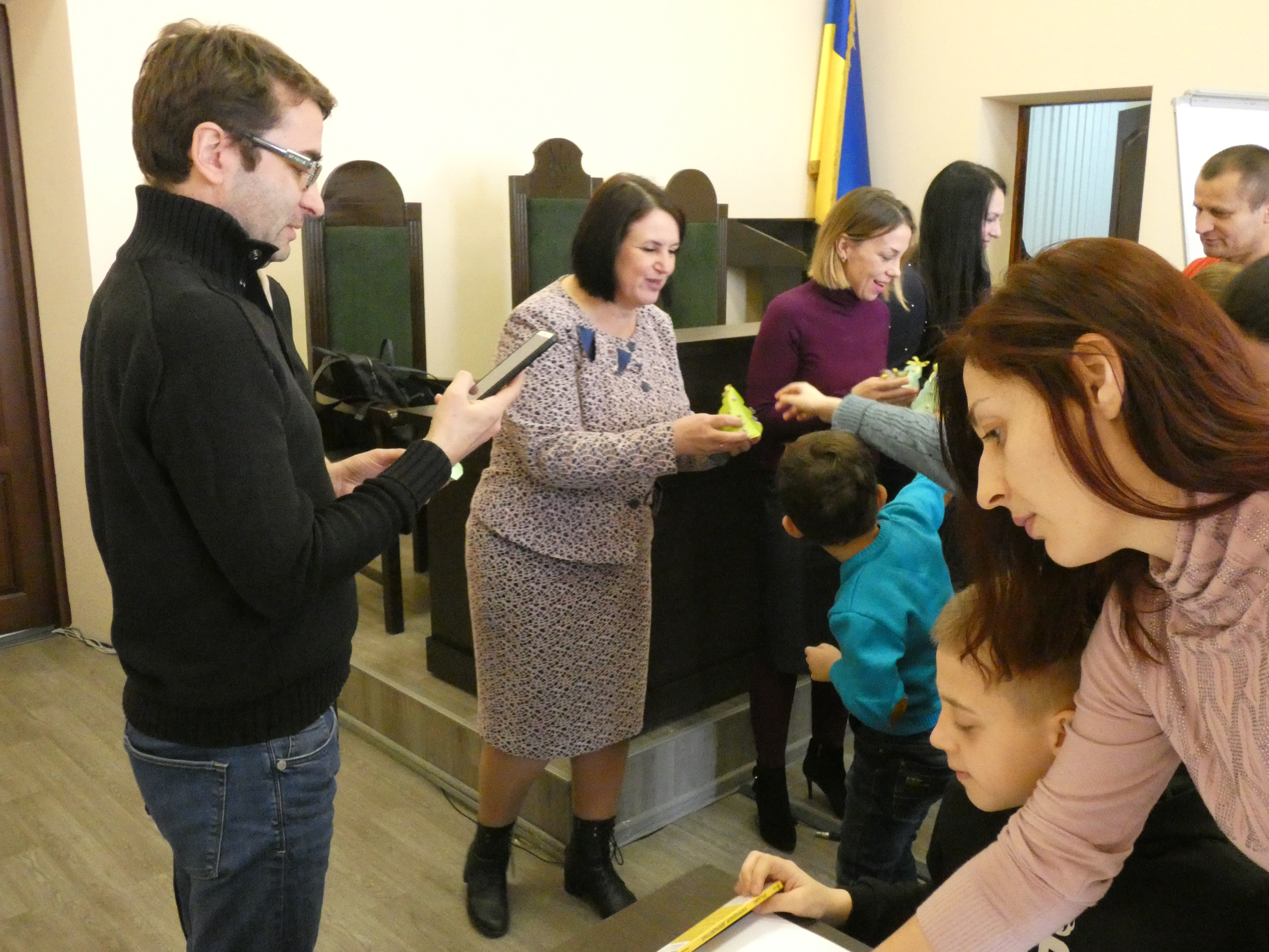Малювали ж діти упродовж години: зображували новорічні і судові атрибути, казкові храми Феміди і навіть динозаврів. Потім свої роботи подарували суду, а Тетяна Шемета від імені суддів презентувала юним художникам солодкі призи і набори для малювання.