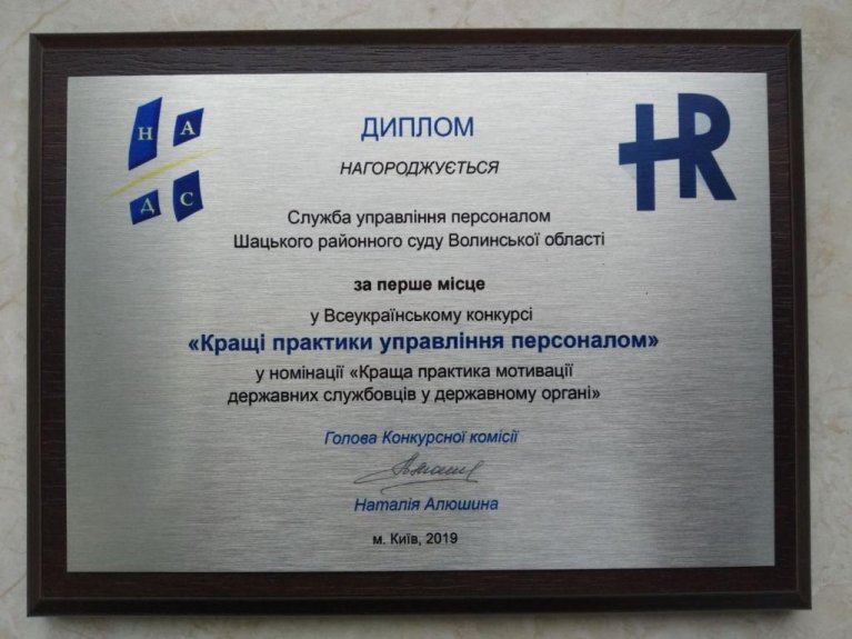 Вітаємо службу управління персоналом Шацького районного суду Волинської області із зайнятим першим місцем на Всеукраїнському конкурсі «Кращі практики управління персоналом» в номінації краща практика мотивації державних службовців у державному органі.