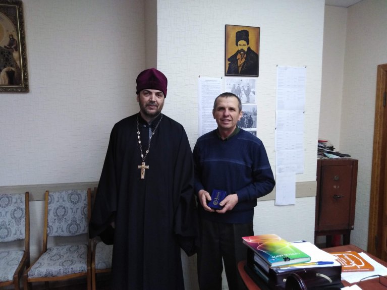 Медаль було вручено Протоієрейем Віктором Піхур Храма Гергія Переможця Української Православної Церкви Київського Патріархату Черкаської області, який відзначив особливість людей, які боронять свою землю, їх патріотизм і розуміння, що вони роблять для всіх українців життєво важливу справу та зазначив, що найголовніша зброя, перед якою важко устояти будь-якому ворогу – це сильна любов до Батьківщини в серці.