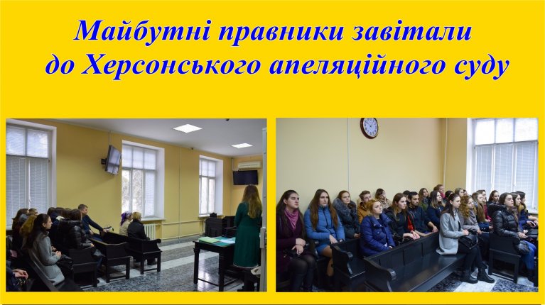Нещодавно Херсонський апеляційний суд зустрічав студентів Херсонського економіко-правового коледжу правознавчого відділення. Візит до суду став гарною нагодою поспілкуватися із суддями та працівниками апарату суду, побувати у судовому засіданні та визначитися із напрямом майбутньої професійної діяльності.
