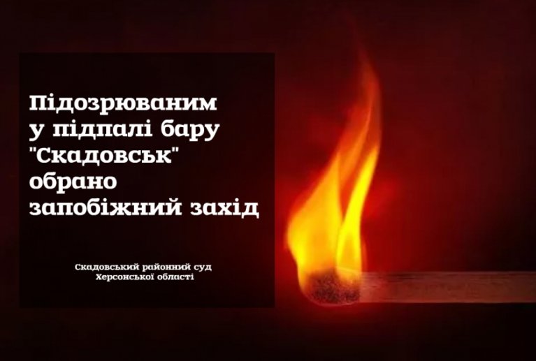 Органами слідства громадяни Л. та Т. підозрюється у тому, що 18.01.2020, близько 07:40, прибули на територію майданчика для паркування автомобілів, який знаходиться навпроти центрального входу до кафе-бару «Скадовськ» за адресою: Херсонська область, м. Скадовськ, вул. Незалежності де громадянин Т. залишився здійснював контроль за діями оточуючих осіб, а громадянин Л., направився до центрального входу цього розважального закладу, де з пластикової ємності, яка знаходилась при ньому, здійснив розбризкування легкозаймистої рідкої речовини на стіни з дерев’яних дощок та декоративне оздоблення центрального входу кафе-бару «Скадовськ», після чого підпалив розбризкану ним речовину та разом з Т. місце вчинення злочину залишив.