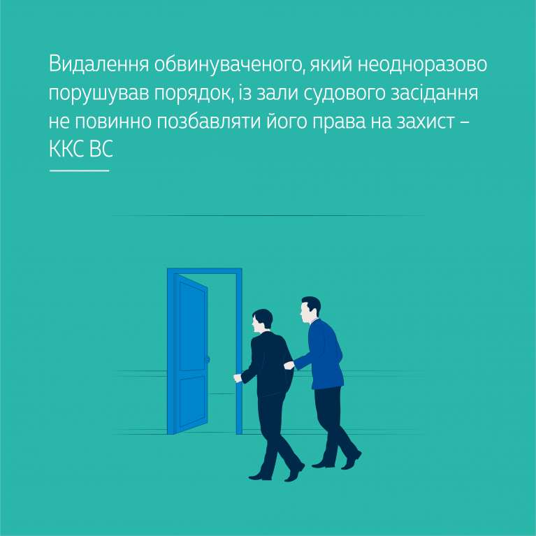 Таким чином, проаналізувавши наведене, колегія суддів ККС ВС зробила висновок, що видалення обвинуваченого із зали судового засідання не повинно було позбавити його можливості реалізувати права. Навіть за умови, що обвинувачений є системним порушником порядку в судовому засіданні, це не мало позбавити його права на захист. Крім того, апеляційний суд був зобов’язаний залучити захисника для здійснення захисту особи за призначенням і відкласти судовий розгляд на строк, необхідний для його підготовки до захисту.