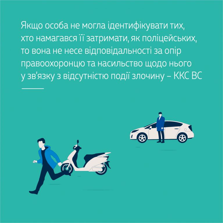 Якщо особа не могла ідентифікувати тих, хто намагався її затримати, як поліцейських, то вона не несе відповідальності за опір правоохоронцю та насильство щодо нього у зв’язку з відсутністю події злочину – ККС ВС