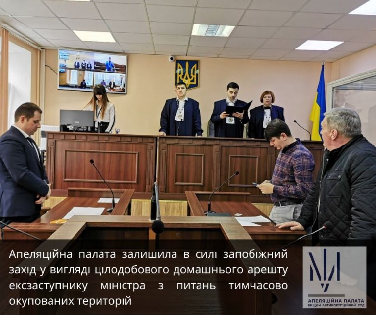Сьогодні, 10 лютого 2020 року, Апеляційна палата Вищого антикорупційного суду розглянула апеляційну скаргу прокурора САП на ухвалу слідчого судді Вищого антикорупційного суду від 30 січня 2020 року про зміну підозрюваному, ексзаступника міністра з питань тимчасово окупованих територій, запобіжного заходу у вигляді тримання під вартою та застосування домашнього арешту.