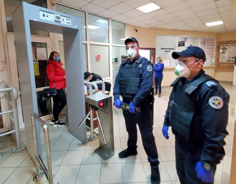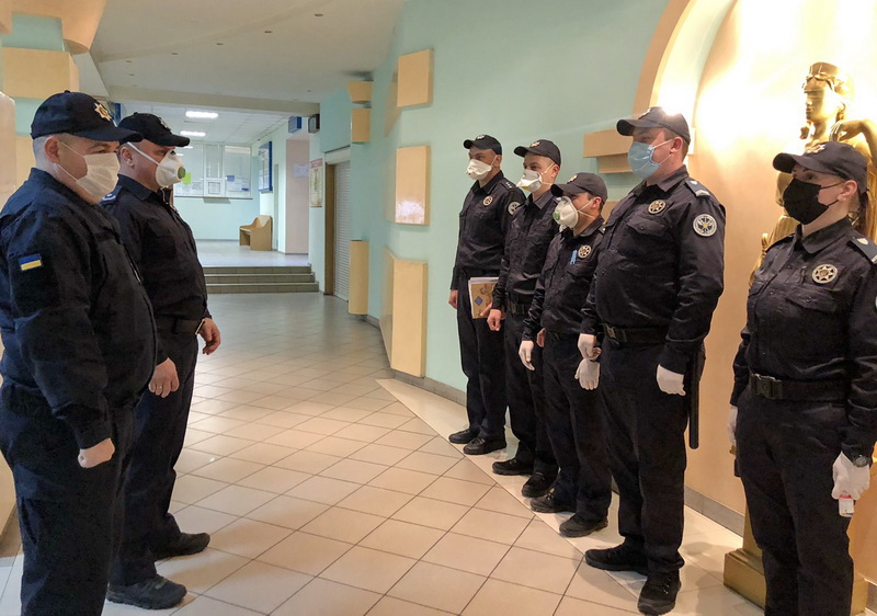 На виконання наказу Голови Служби судової охорони Валерія Бондаря, співробітники Служби, які приступили до стажування із забезпечення охорони, безпеки та громадського порядку в Малиновському районному суді, несуть службу в захисних масках, окулярах і рукавичках.