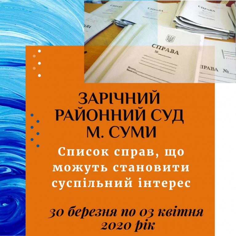 Зарічний районний суд м. Суми повідомляє, що список справ, які розглядатимуться судом у період з 30 березня по 3 квітня 2020 року і можуть становити суспільний інтерес, розміщені на веб – сайті суду в розділі «Інформація по справам» за посиланням: https://zr.su.court.gov.ua/sud1805/inf_spr/spravsusint/916927/.
