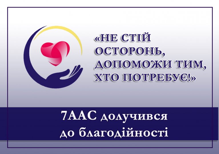 Благодійна акція «Не стій осторонь, допоможи тим, хто потребує!» ініційована суддями Сьомого апеляційного адміністративного суду. Вона має стати своєрідним челенджом, адже до благодійності можуть долучитись судді та працівники апаратів судів Вінниці та Вінницької області, а також представники судів нашого апеляційного адміністративного округу (Вінницька, Чернівецька, Хмельницька та Житомирська області). Усі охочі можуть організувати благодійні акції у своїх регіонах та відповідно зібрати і перерахувати кошти у спеціалізовані фонди на місцях.