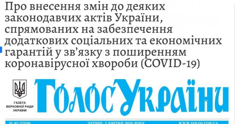 2 квітня 2020 року Закон України «Про внесення змін до деяких законодавчих актів України, спрямованих на забезпечення додаткових соціальних та економічних гарантій у зв’язку з поширенням коронавірусної хвороби (COVID-19)»  № 540-IX від 30 березня 2020 року оприлюднено у газеті "Голос України".