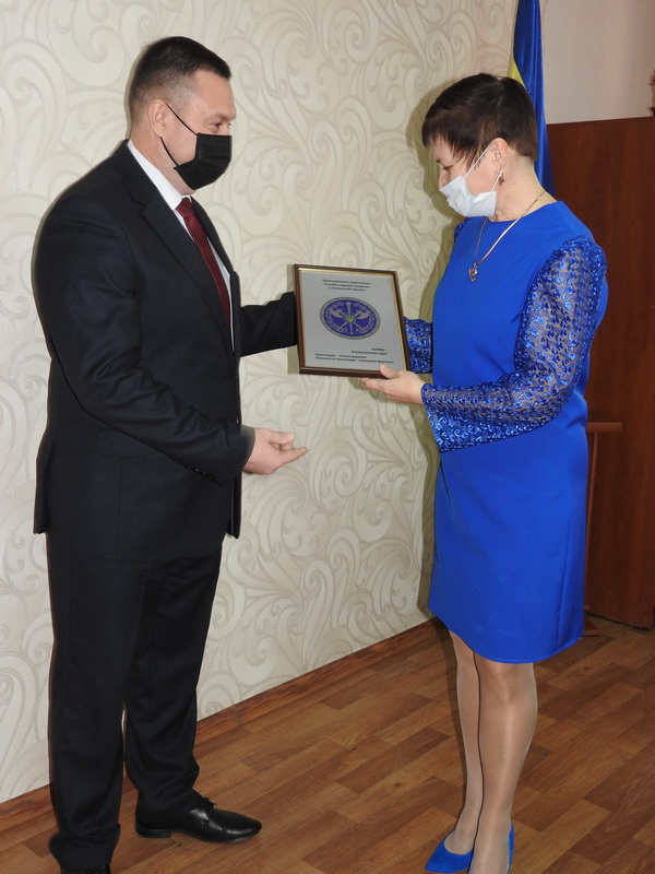 Полковник Служби судової охорони Вячеслав Абрамов вручив голові суду Анжеліці Архипенко символічний знак Служби на підтвердження того, що відтепер судді, працівники апарату суду та усі учасники судового процесу перебуватимуть у повній безпеці.
