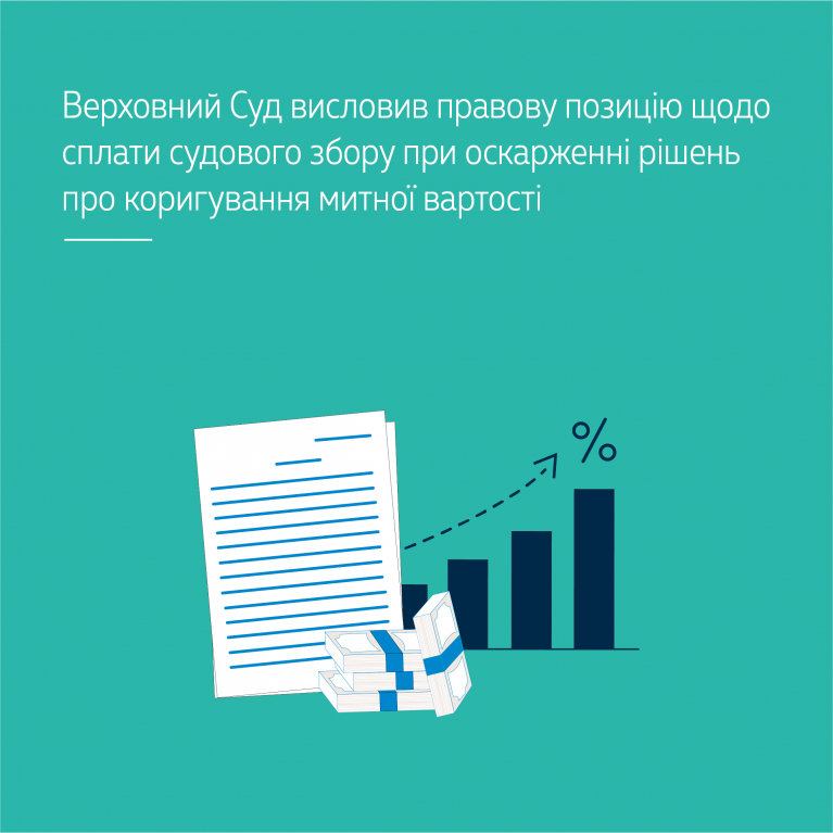 На цій підставі судова палата з розгляду справ щодо податків, зборів та інших обов’язкових платежів Касаційного адміністративного суду у складі Верховного Суду сформулювала правовий висновок, відповідно до якого при оскарженні рішення про коригування митної вартості товарів ціною позову в розумінні підпункту 1 п. 3 ч. 2 ст. 4 Закону України «Про судовий збір» є різниця митних платежів, що підлягали сплаті з урахуванням митної вартості, розрахованої декларантом, та митної вартості, розрахованої митним органом в оскаржуваному рішенні.