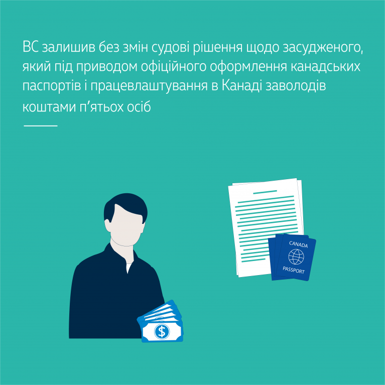 Касаційний кримінальний суд у складі Верховного Суду залишив без задоволення касаційні скарги захисника та засудженого до покарання у виді позбавлення волі на строк три роки за заволодіння чужим майном шляхом обману, вчинене повторно (частини 1, 2 ст. 190 КК України). Відповідно до вироку, який апеляційний суд залишив без зміни, чоловік був визнаний винним у тому, що в грудні 2017 року та в травні 2018 року в Тернополі під приводом офіційного оформлення канадських паспортів і працевлаштування в Канаді заволодів грошовими коштами пʼятьох осіб у розмірі майже 200 тис. грн.