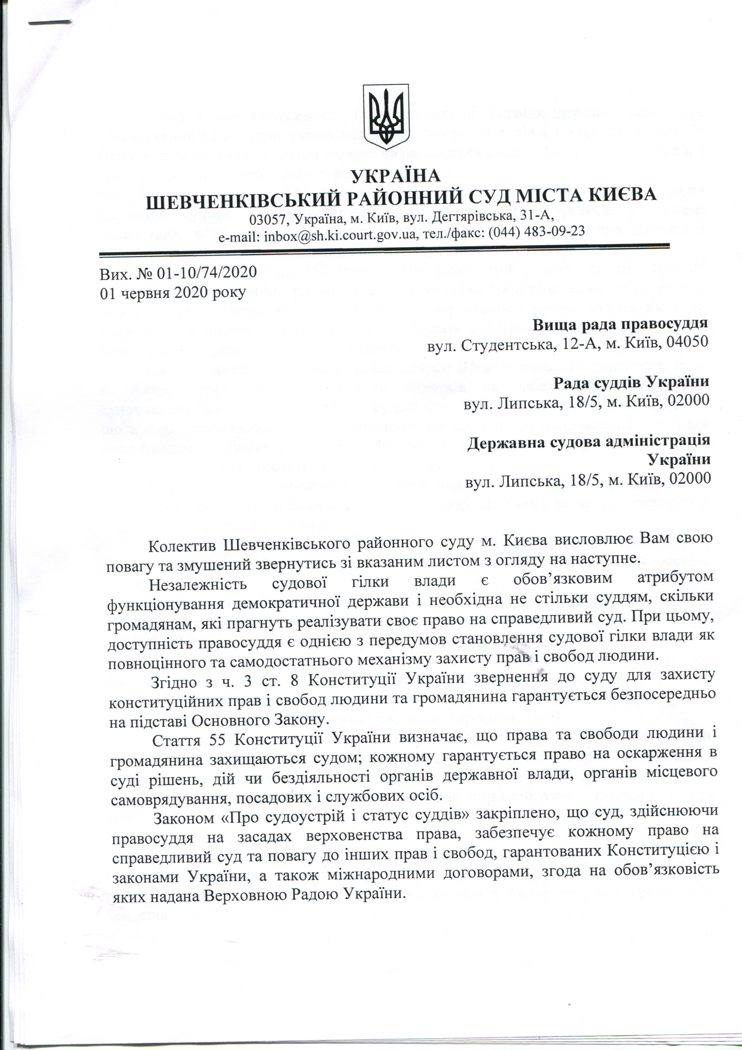 З метою вирішення ситуації, що склалася в Шевченківському районному суді з відправленням поштової кореспонденції, яка перешкоджає як належному повідомленню учасників справ про судові засідання, так і відправленню правосуддя в межах повноважень, визначених законом, Шевченківський районний суд міста Києва звернувся до Вищої ради правосуддя, Ради суддів України та Державної судової адміністрації України з листом (додається), в якому просив звернути увагу та врахувати вказані обставини при надходженні дисциплінарних скарг на суддів, пов’язаних з порушенням процесуальних строків розгляду справ, а також вжити необхідних заходів щодо ситуації, яка виникла внаслідок неналежного забезпечення фінансування діяльності суду щодо витрат, пов’язаних з відправленням поштової кореспонденції (судових повісток, копій процесуальних документів тощо).