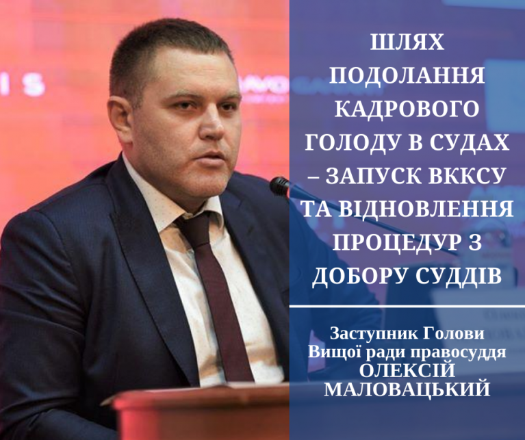 Єдиний шлях подолання кадрового голоду в судах, вважає він, – це якнайшвидший запуск Вищої кваліфікаційної комісії суддів України та відновлення усіх процедур, зокрема кваліфікаційного оцінювання, проведення конкурсів, призначення та підвищення суддів тощо. Така можливість з’явиться в разі ухвалення внесеного до парламенту Президентом України законопроєкту № 3711, який позитивно оцінила Вища рада правосуддя. Крім того, для вирішення проблеми, на думку Олексія Маловацького, доцільно проаналізувати недоліки процесуальних кодексів, які діють уже третій рік, та внести зміни до них для прискорення розгляду справ, а також визначити граничне навантаження на суддів.